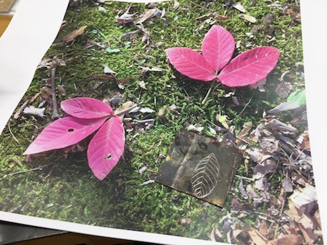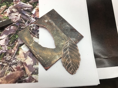 銅板を熱して酸化で表面を黒くし、葉のデザインをケガいて、切り取り。